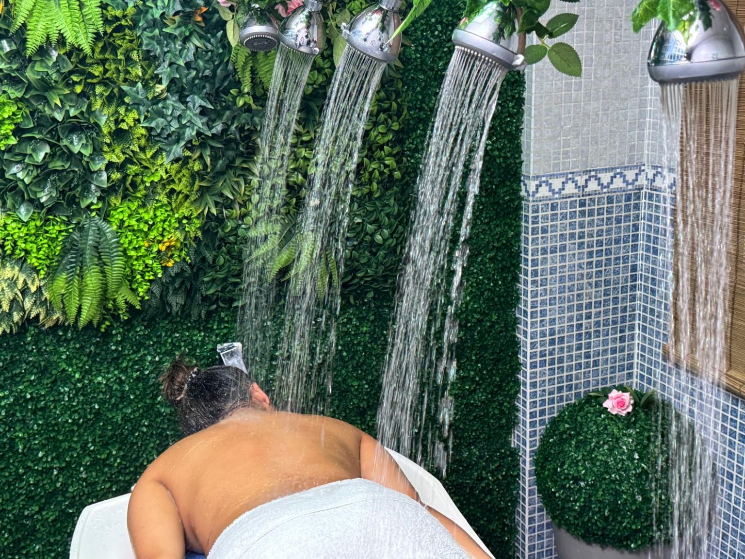 Este tratamiento es muy completo consiste en un masaje con aceites esenciales, peeling corporal y los chorros de agua con geles especiales.